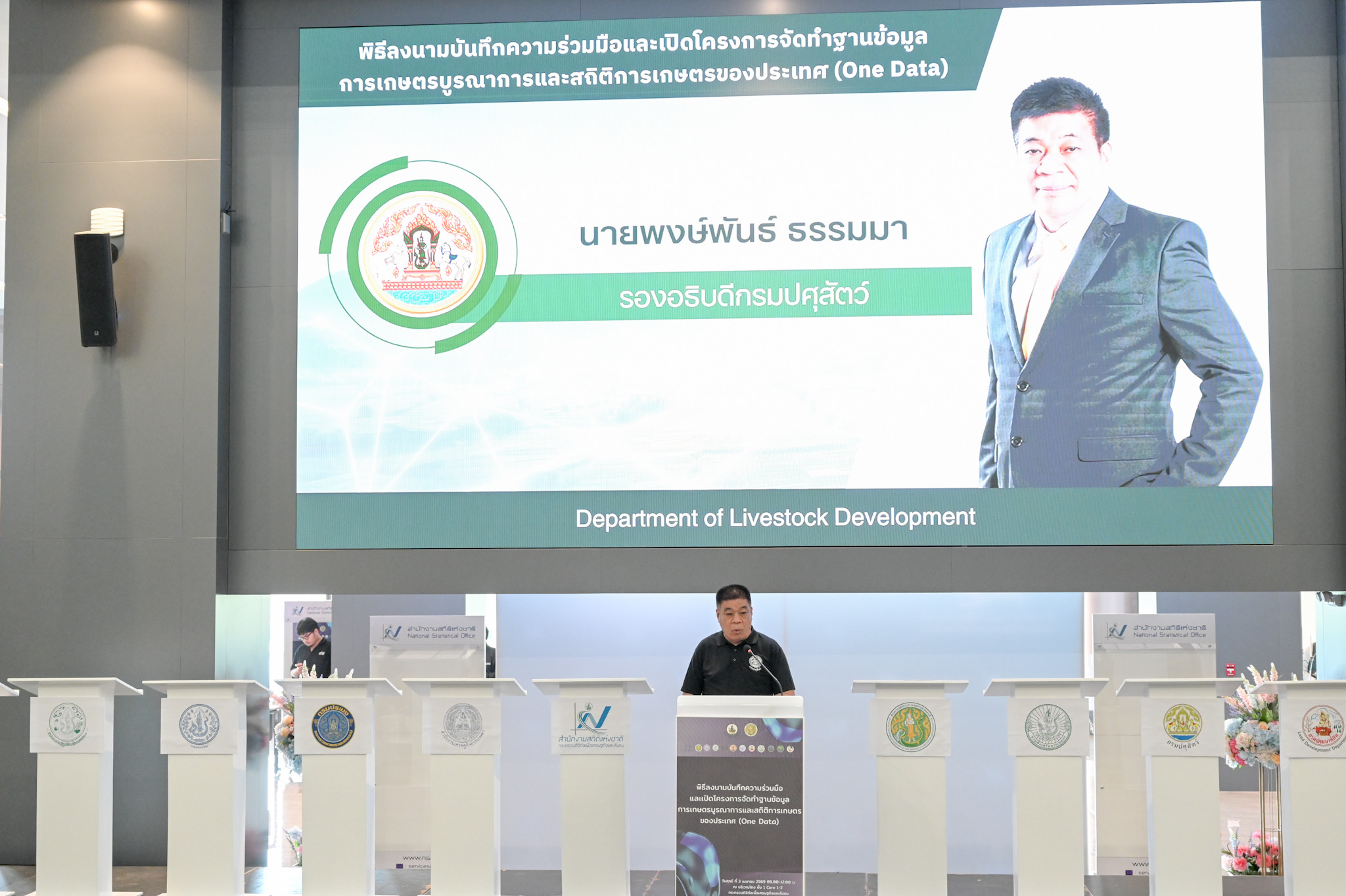 นายจิระวุฒิ จันทร์งาม ผู้อำนวยการศูนย์เทคโนโลยีสารสนเทศและการสื่อสาร กรมปศุสัตว์ พร้อมด้วยนายปิยวิทย์ ธรรมบุตร หัวหน้ากลุ่มสารสนเทศและข้อมูลสถิติ ได้เข้าร่วมงานพิธีลงนามบันทึกความร่วมมือ (MOU) ระหว่างหน่วยงานในสังกัดกระทรวงเกษตรและสหกรณ์ และสำนักงานสถิติแห่งชาติ พร้อมทั้งเปิดโครงการจัดทำฐานข้อมูลการเกษตรบูรณาการและสถิติการเกษตรของประเทศ (One Data) โดยมีนายเอกพงษ์ หริ่มเจริญ ผู้อำนวยการสำนักงานสถิติแห่งชาติ คณะผู้บริหาร และผู้แทนจากหน่วยงานที่เกี่ยวข้อง เข้าร่วม ณ โถงชั้น 1 กระทรวงดิจิทัลเพื่อเศรษฐกิจและสังคม ศูนย์ราชการฯ แจ้งวัฒนะ กรุงเทพฯ เพื่อยกระดับการพัฒนาข้อมูลการเกษตรของประเทศ โดยบูรณาการข้อมูลการเกษตรจาก 12 หน่วยงาน ได้แก่ กระทรวงเกษตรและสหกรณ์ กรมส่งเสริมการเกษตร กรมประมง กรมปศุสัตว์ กรมหม่อนไหม กรมพัฒนาที่ดิน กรมชลประทาน กรมส่งเสริมสหกรณ์ สำนักงานการปฏิรูปที่ดินเพื่อเกษตรกรรม สำนักงานเศรษฐกิจการเกษตร การยางแห่งประเทศไทย และสำนักงานสถิติแห่งชาติ โดยใช้เทคโนโลยีดิจิทัลและเครื่องมือทางสถิติในการรวบรวมและเชื่อมโยงข้อมูลการเกษตรทุกมิติ เพื่อให้ข้อมูลมีมาตรฐานเดียวกันและลดความซ้ำซ้อนและเป็นแหล่งข้อมูลสำหรับการวิเคราะห์และบริหารจัดการเชิงนโยบายเพื่อพัฒนาภาคการเกษตรในอนาคต